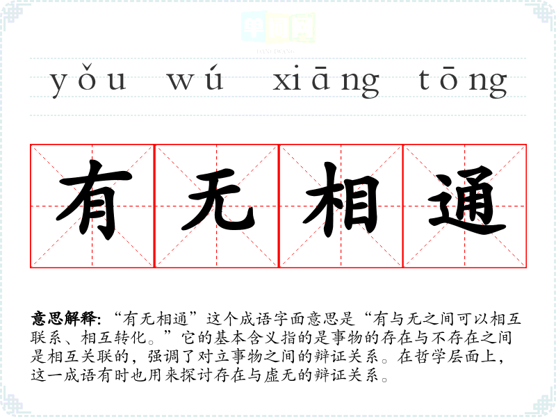 “有无相通”这个成语字面意思是“有与无之间可以相互联系、相互转化。”它的基本含义指的是事物的存在与不存在之间是相互关联的,强调了对立事物之间的辩证关系。在哲学层面上,这一成语有时也用来探讨存在与虚无的辩证关系。