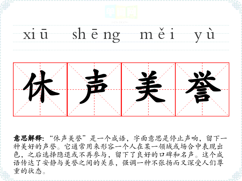“休声美誉”是一个成语,字面意思是停止声响,留下一种美好的声誉。它通常用来形容一个人在某一领域或场合中表现出色,之后选择隐退或不再参与,留下了良好的口碑和名声。这个成语传达了安静与美誉之间的关系,强调一种不张扬而又深受人们尊重的状态。