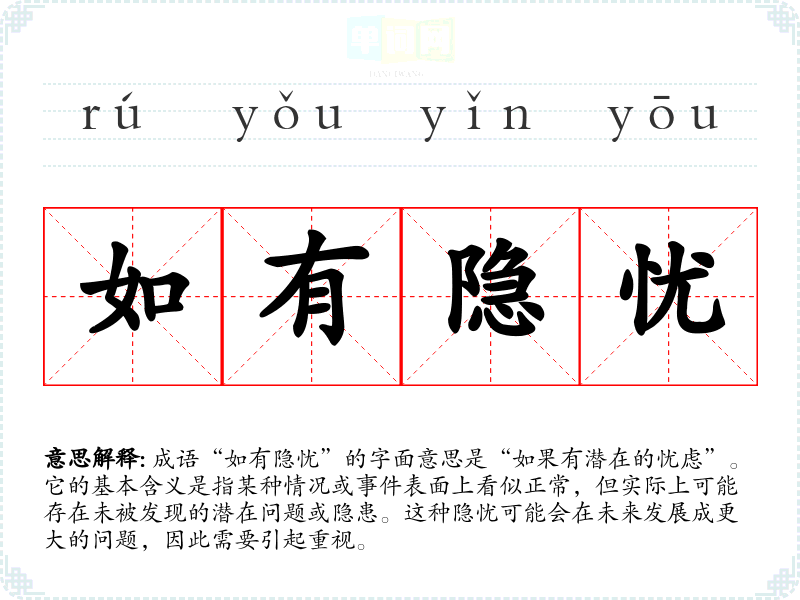 “如有隐忧”并不是一个传统意义上的成语,而更像是一个常用的短语或表达。其构成部分“隐忧”源于汉语中“隐”表示隐藏、潜在,“忧”表示忧虑、担心。这个短语可能在现代汉语中逐渐流行,尤其是在涉及心理、情感或社会问题的讨论中。