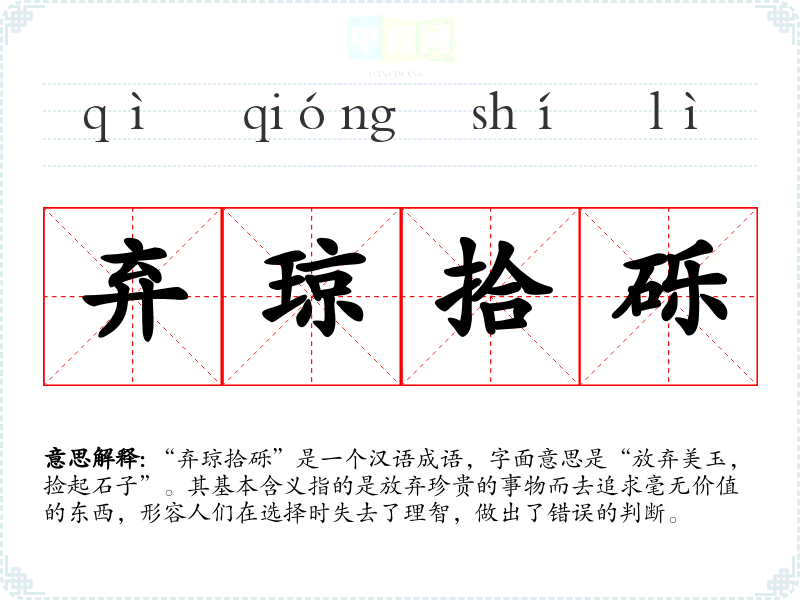 “弃琼拾砾”是一个汉语成语,字面意思是“放弃美玉,捡起石子”。其基本含义指的是放弃珍贵的事物而去追求毫无价值的东西,形容人们在选择时失去了理智,做出了错误的判断。