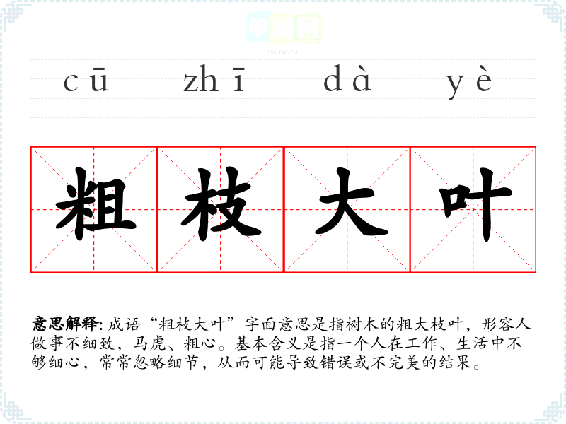 成语“粗枝大叶”字面意思是指树木的粗大枝叶,形容人做事不细致,马虎、粗心。基本含义是指一个人在工作、生活中不够细心,常常忽略细节,从而可能导致错误或不完美的结果。