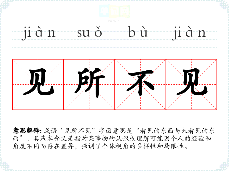 成语“见所不见”字面意思是“看见的东西与未看见的东西”。其基本含义是指对某事物的认识或理解可能因个人的经验和角度不同而存在差异,强调了个体视角的多样性和局限性。