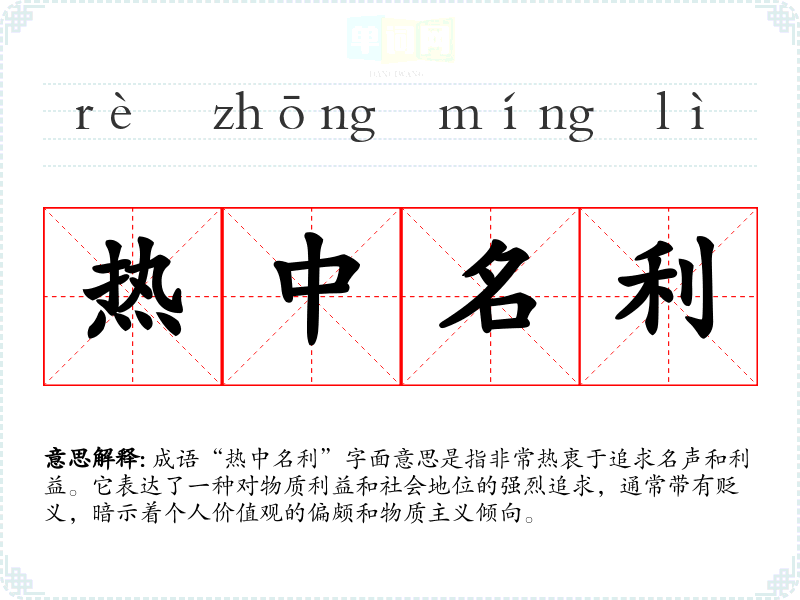 成语“热中名利”字面意思是指非常热衷于追求名声和利益。它表达了一种对物质利益和社会地位的强烈追求,通常带有贬义,暗示着个人价值观的偏颇和物质主义倾向。