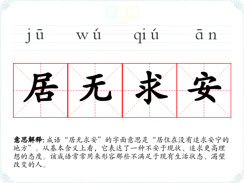 成语“居无求安”的字面意思是“居住在没有追求安宁的地方”。从基本含义上看,它表达了一种不安于现状、追求更高理想的态度。该成语常常用来形容那些不满足于现有生活状态、渴望改变的人。