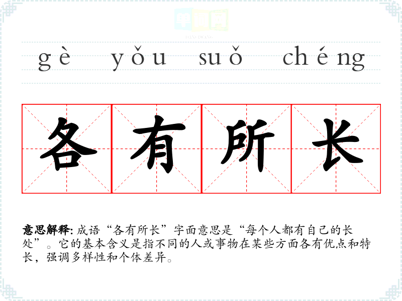 成语“各有所长”字面意思是“每个人都有自己的长处”。它的基本含义是指不同的人或事物在某些方面各有优点和特长,强调多样性和个体差异。