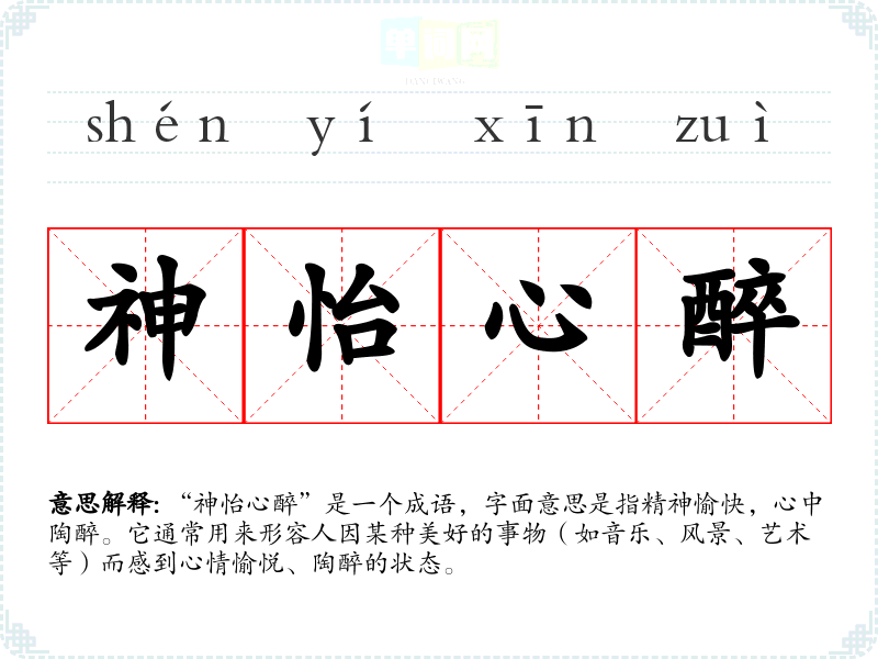 “神怡心醉”是一个成语,字面意思是指精神愉快,心中陶醉。它通常用来形容人因某种美好的事物(如音乐、风景、艺术等)而感到心情愉悦、陶醉的状态。