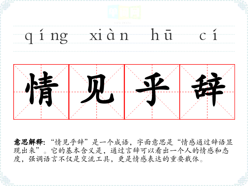 “情见乎辞”是一个成语,字面意思是“情感通过辞语显现出来”。它的基本含义是,通过言辞可以看出一个人的情感和态度,强调语言不仅是交流工具,更是情感表达的重要载体。