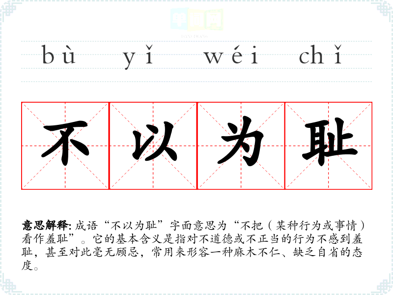 成语“不以为耻”字面意思为“不把(某种行为或事情)看作羞耻”。它的基本含义是指对不道德或不正当的行为不感到羞耻,甚至对此毫无顾忌,常用来形容一种麻木不仁、缺乏自省的态度。
