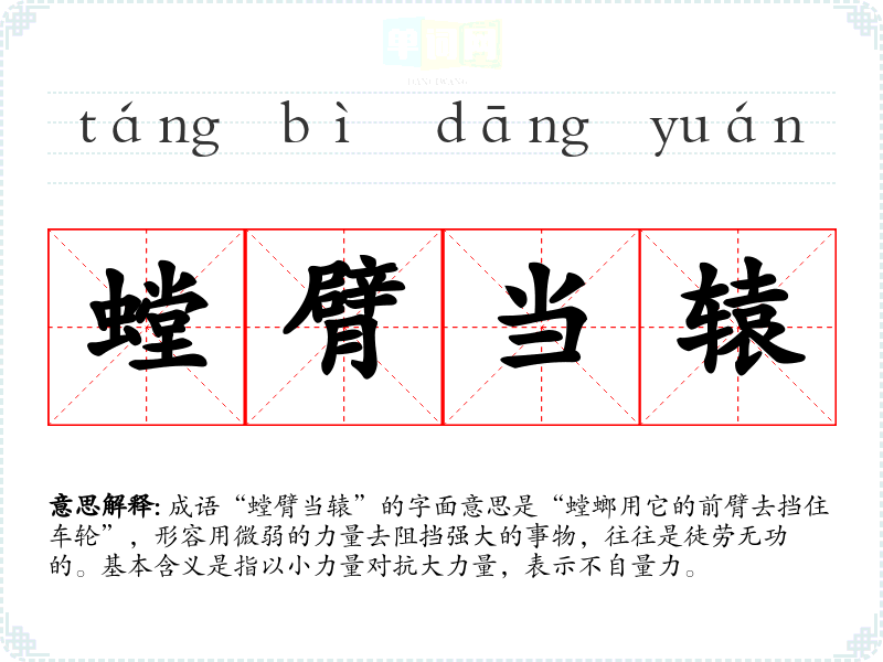 | 以螳挡车 | 用螳螂的胳膊来阻挡车轮前进。比喻自不量力 |