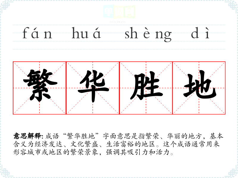 成语“繁华胜地”字面意思是指繁荣、华丽的地方,基本含义为经济发达、文化繁盛、生活富裕的地区。这个成语通常用来形容城市或地区的繁荣景象,强调其吸引力和活力。