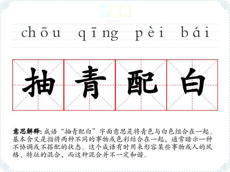成语“抽青配白”字面意思是将青色与白色组合在一起。基本含义是指将两种不同的事物或色彩结合在一起,通常暗示一种不协调或不搭配的状态。这个成语有时用来形容某些事物或人的风格、特征的混合,而这种混合并不一定和谐。