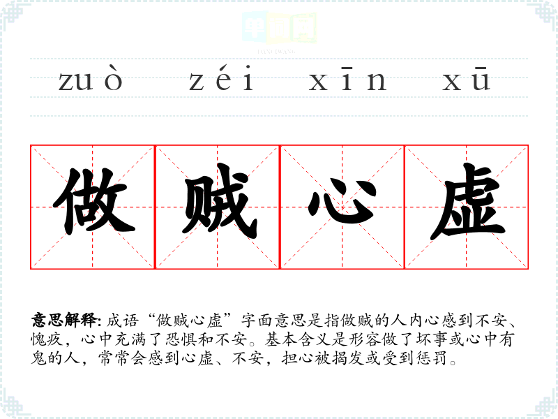 成语“做贼心虚”字面意思是指做贼的人内心感到不安、愧疚,心中充满了恐惧和不安。基本含义是形容做了坏事或心中有鬼的人,常常会感到心虚、不安,担心被揭发或受到惩罚。