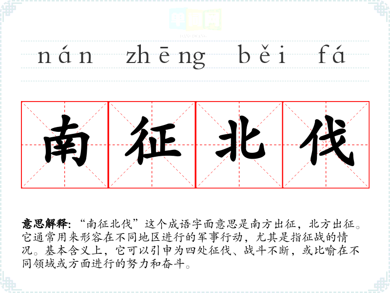 “南征北伐”这个成语字面意思是南方出征,北方出征。它通常用来形容在不同地区进行的军事行动,尤其是指征战的情况。基本含义上,它可以引申为四处征伐、战斗不断,或比喻在不同领域或方面进行的努力和奋斗。