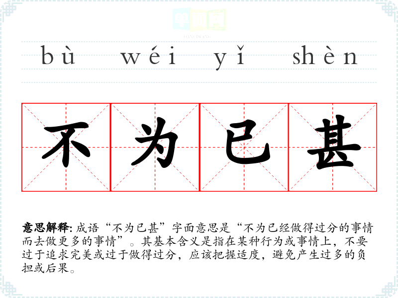 成语“不为已甚”字面意思是“不为已经做得过分的事情而去做更多的事情”。其基本含义是指在某种行为或事情上,不要过于追求完美或过于做得过分,应该把握适度,避免产生过多的负担或后果。