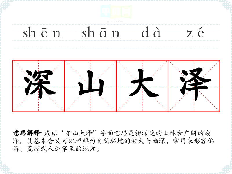 成语“深山大泽”字面意思是指深邃的山林和广阔的湖泽。其基本含义可以理解为自然环境的浩大与幽深,常用来形容偏僻、荒凉或人迹罕至的地方。