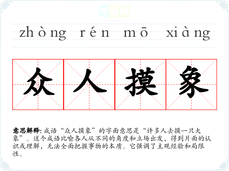 通过对“众人摸象”的学,我认识到在沟通和表达中,全面性和多角度的重要性。这不仅帮助我在思考问题时更加周全,也促使我在与他人交流时更加留意不同的观点。这一成语在我的语言学和表达中,提醒我不断拓宽视野,避免片面化的判断。