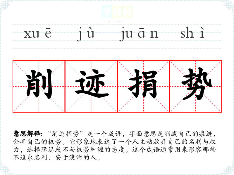 “削迹捐势”是一个成语,字面意思是削减自己的痕迹,舍弃自己的权势。它形象地表达了一个人主动放弃自己的名利与权力,选择隐退或不与权势纠缠的态度。这个成语通常用来形容那些不追求名利、安于淡泊的人。