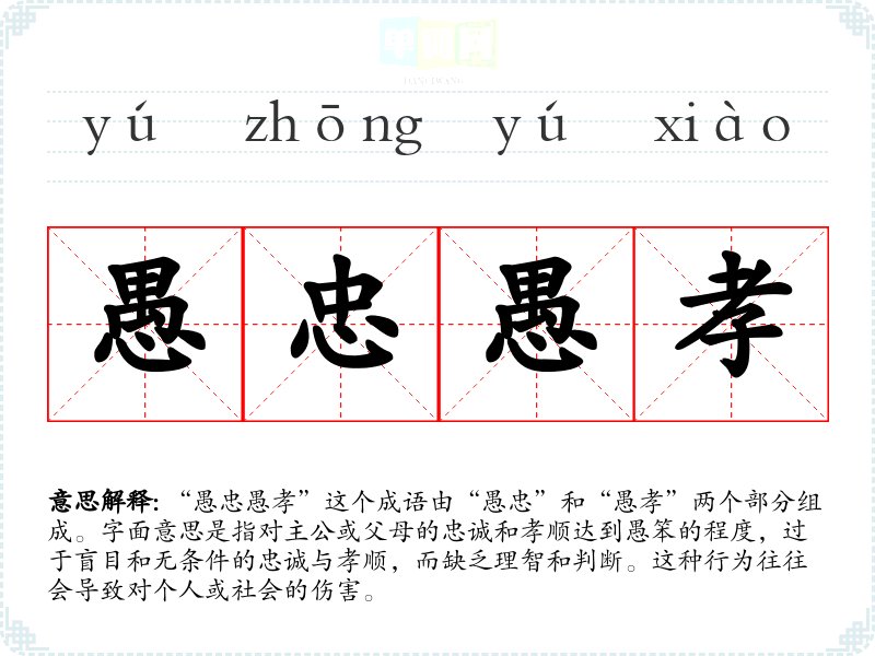 “愚忠愚孝”这个成语由“愚忠”和“愚孝”两个部分组成。字面意思是指对主公或父母的忠诚和孝顺达到愚笨的程度,过于盲目和无条件的忠诚与孝顺,而缺乏理智和判断。这种行为往往会导致对个人或社会的伤害。