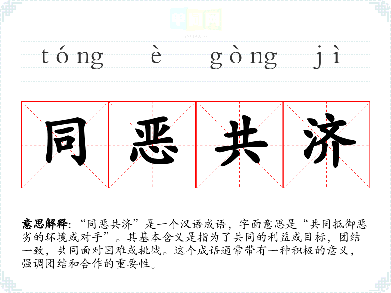 通过对“同恶共济”的全面学,我认识到团结合作的重要性,特别是在面临困难和挑战时。这个成语不仅丰富了我的汉语表达,也让我在生活中更加关注团队合作和相互支持的价值。总之,“同恶共济”在我的语言学和表达中具有深远的影响,提醒我在任何情况下都要珍视团体的力量与和谐。