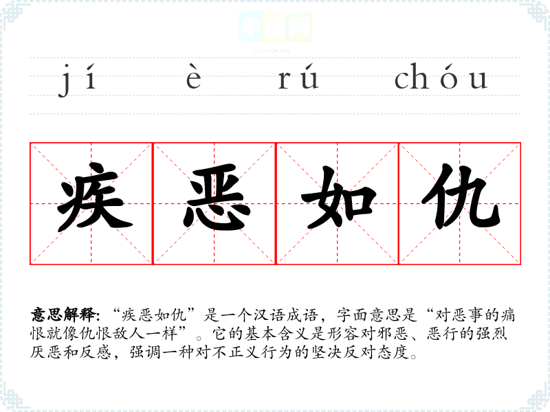 “疾恶如仇”是一个汉语成语,字面意思是“对恶事的痛恨就像仇恨敌人一样”。它的基本含义是形容对邪恶、恶行的强烈厌恶和反感,强调一种对不正义行为的坚决反对态度。