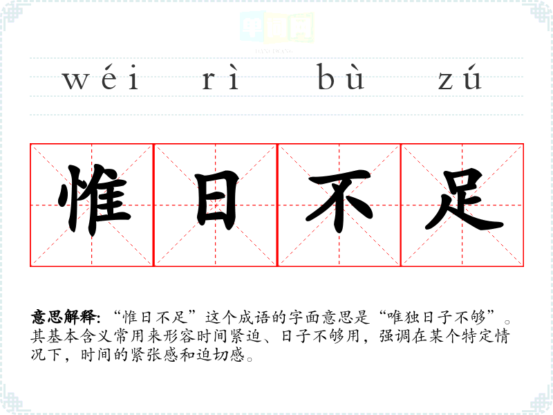 “惟日不足”这个成语的字面意思是“唯独日子不够”。其基本含义常用来形容时间紧迫、日子不够用,强调在某个特定情况下,时间的紧张感和迫切感。
