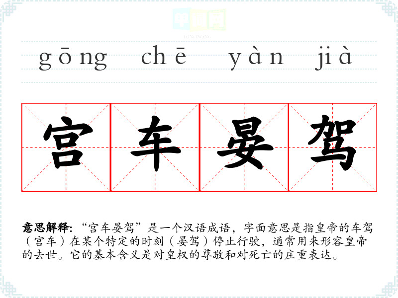 在古代,的地位至高无上,其去世对国家的影响深远。因此,“宫车晏驾”不仅是一个描述死亡的成语,还反映了对皇权的尊重和对帝王业绩的反思。在现代社会,该成语较少使用,但在历史文化讨论和文学作品中依然具有重要意义。