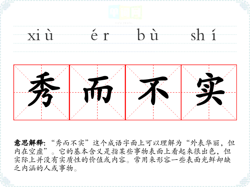 “秀而不实”这个成语字面上可以理解为“外表华丽,但内在空虚”。它的基本含义是指某些事物表面上看起来很出色,但实际上并没有实质性的价值或内容。常用来形容一些表面光鲜却缺乏内涵的人或事物。