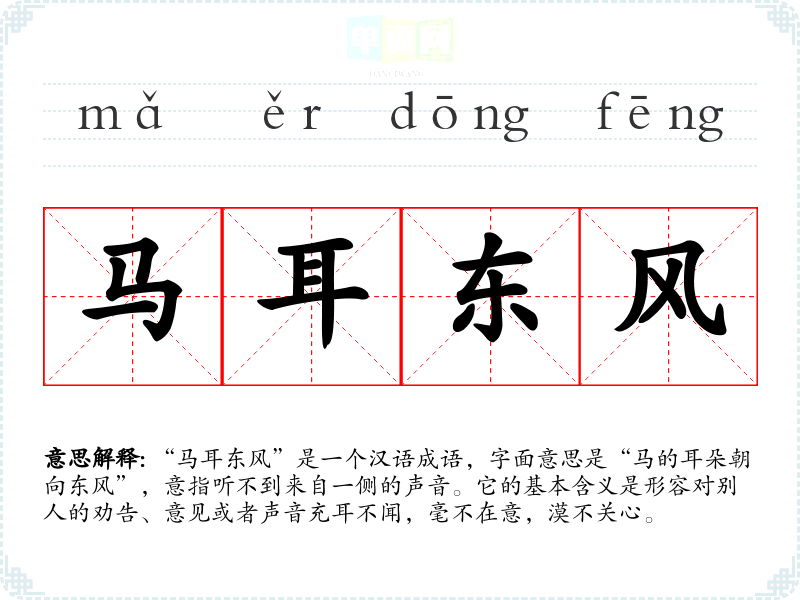 “马耳东风”是一个汉语成语,字面意思是“马的耳朵朝向东风”,意指听不到来自一侧的声音。它的基本含义是形容对别人的劝告、意见或者声音充耳不闻,毫不在意,漠不关心。
