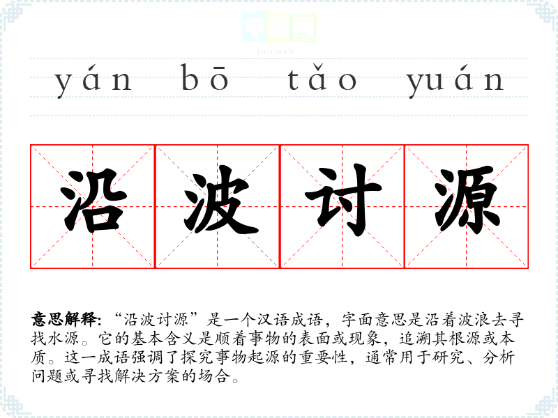沿波讨源 沿波:顺着水流;讨源:探索源头。循着水流寻找源头。原比喻作文时由次要的写到主要的,最后点出主题。后比喻探讨事物的本末。