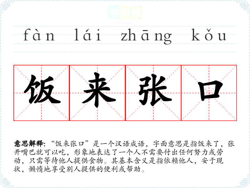 “饭来张口”是一个汉语成语,字面意思是指饭来了,张开嘴巴就可以吃,形象地表达了一个人不需要付出任何努力或劳动,只需等待他人提供食物。其基本含义是指依赖他人,安于现状,懒惰地享受别人提供的便利或帮助。