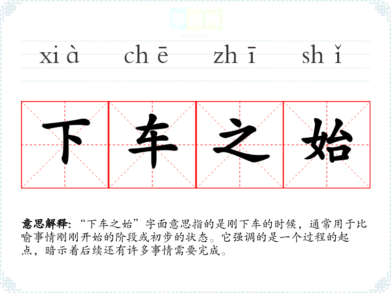 “下车之始”字面意思指的是刚下车的时候,通常用于比喻事情刚刚开始的阶段或初步的状态。它强调的是一个过程的起点,暗示着后续还有许多事情需要完成。