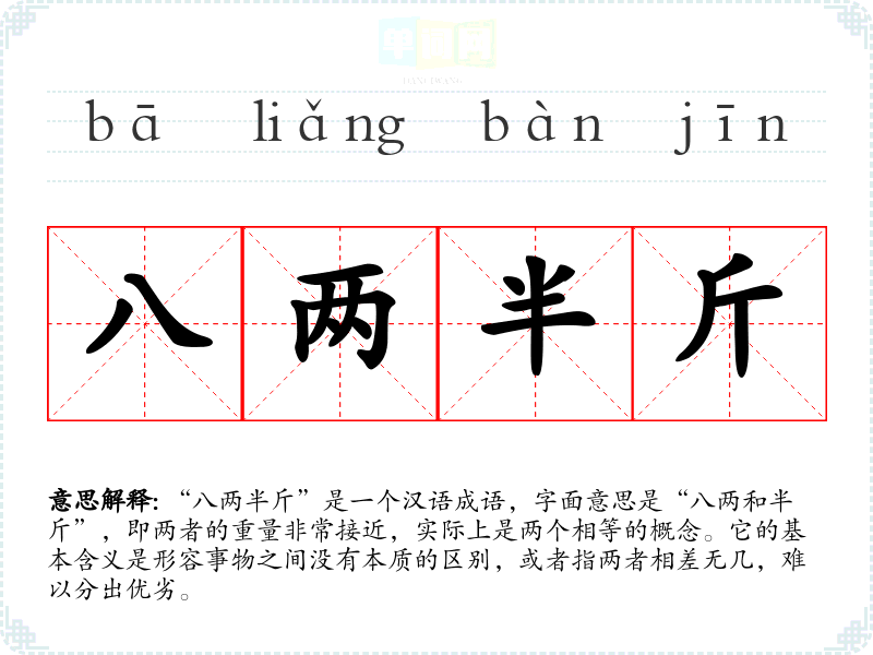 “八两半斤”是一个汉语成语,字面意思是“八两和半斤”,即两者的重量非常接近,实际上是两个相等的概念。它的基本含义是形容事物之间没有本质的区别,或者指两者相差无几,难以分出优劣。
