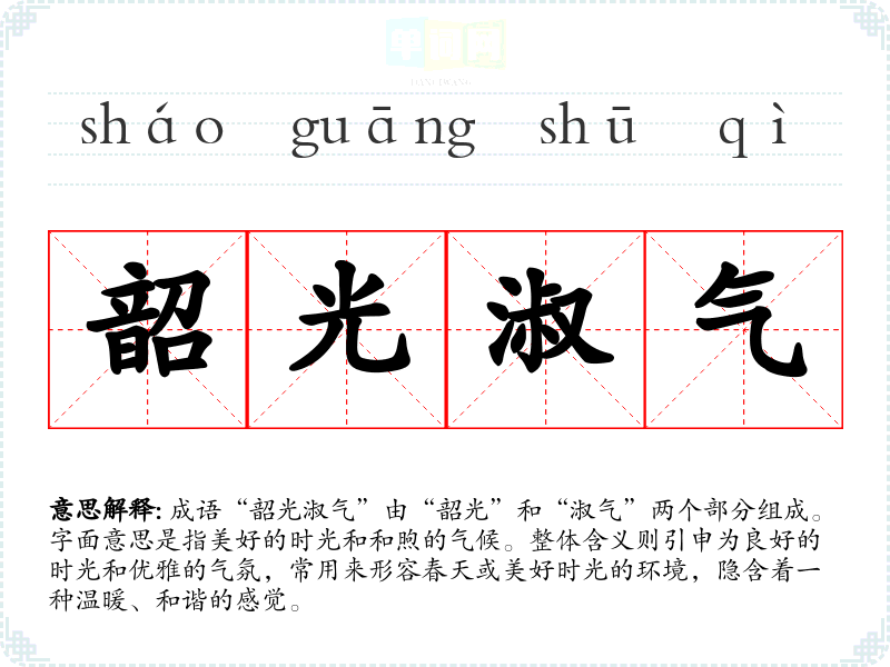成语“韶光淑气”由“韶光”和“淑气”两个部分组成。字面意思是指美好的时光和和煦的气候。整体含义则引申为良好的时光和优雅的气氛,常用来形容春天或美好时光的环境,隐含着一种温暖、和谐的感觉。