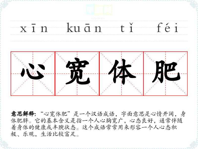 “心宽体肥”是一个汉语成语,字面意思是心情开阔,身体肥胖。它的基本含义是指一个人心胸宽广,心态良好,通常伴随着身体的健康或丰腴状态。这个成语常常用来形容一个人心态积极、乐观,生活比较富足。