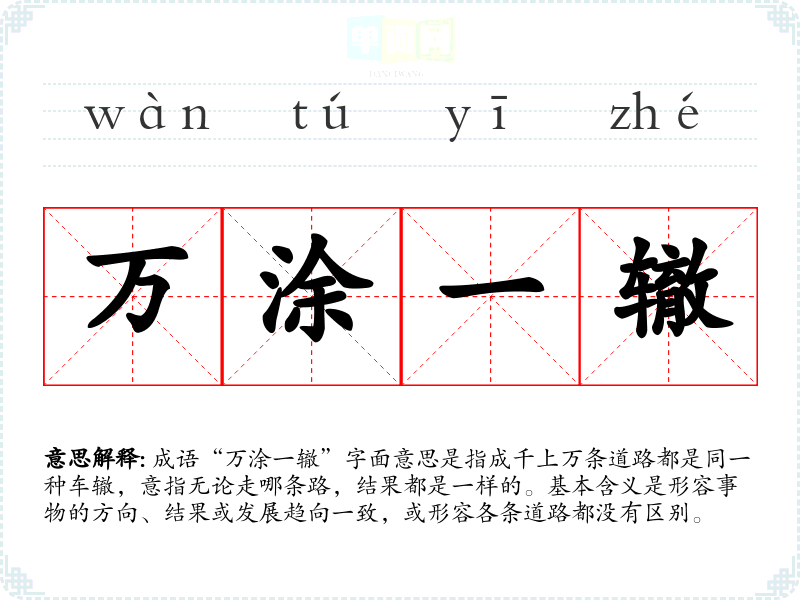 成语“万涂一辙”字面意思是指成千上万条道路都是同一种车辙,意指无论走哪条路,结果都是一样的。基本含义是形容事物的方向、结果或发展趋向一致,或形容各条道路都没有区别。