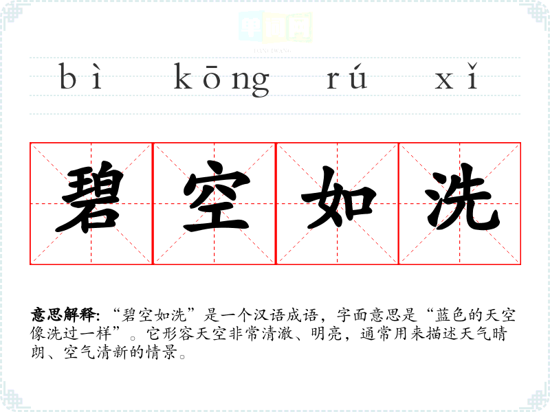 该成语的词源并不明确,但“碧空”指的是清澈的蓝天,“如洗”则形象地表达了天空的纯净。类似的表达在古代诗词中常见,许多文人墨客在描写自然景观时,都会用到类似的意象,表现出对美好天气的赞美。