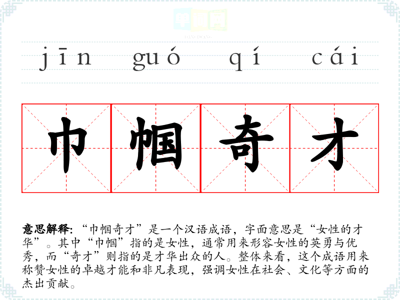 “巾帼奇才”是一个汉语成语,字面意思是“女性的才华”。其中“巾帼”指的是女性,通常用来形容女性的英勇与优秀,而“奇才”则指的是才华出众的人。整体来看,这个成语用来称赞女性的卓越才能和非凡表现,强调女性在社会、文化等方面的杰出贡献。