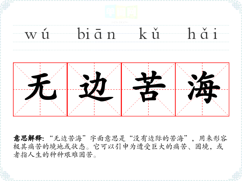 “无边苦海”字面意思是“没有边际的苦海”,用来形容极其痛苦的境地或状态。它可以引申为遭受巨大的痛苦、困境,或者指人生的种种艰难困苦。
