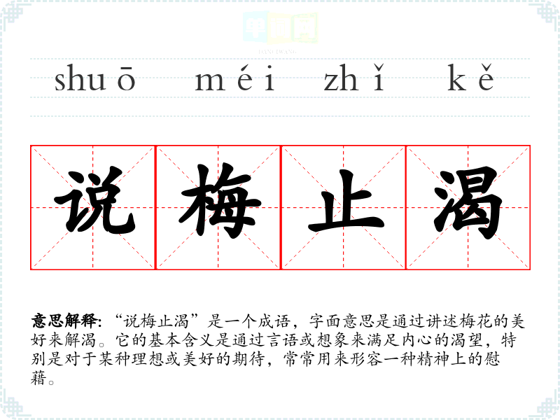 “说梅止渴”是一个成语,字面意思是通过讲述梅花的美好来解渴。它的基本含义是通过言语或想象来满足内心的渴望,特别是对于某种理想或美好的期待,常常用来形容一种精神上的慰藉。