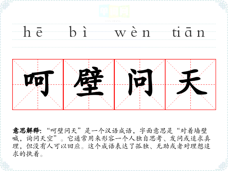 “呵壁问天”是一个汉语成语,字面意思是“对着墙壁喊,询问天空”。它通常用来形容一个人独自思考、发问或追求真理,但没有人可以回应。这个成语表达了孤独、无助或者对理想追求的执着。