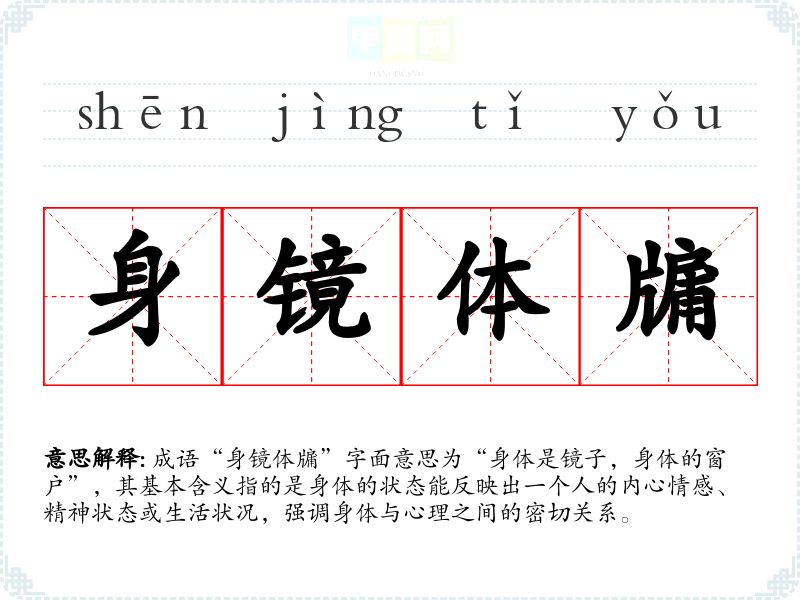 成语“身镜体牖”字面意思为“身体是镜子,身体的窗户”,其基本含义指的是身体的状态能反映出一个人的内心情感、精神状态或生活状况,强调身体与心理之间的密切关系。