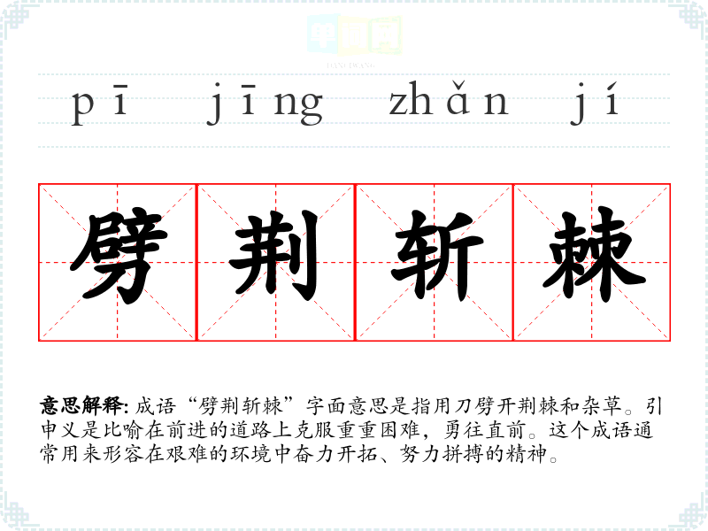 | 披荆斩棘 | 劈开丛生多刺的野生植物。比喻在创业过程中或前进道路上清除障碍,克服重重困难。 |