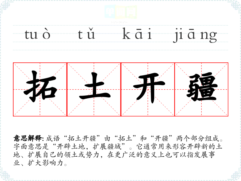 成语“拓土开疆”由“拓土”和“开疆”两个部分组成。字面意思是“开辟土地,扩展疆域”。它通常用来形容开辟新的土地、扩展自己的领土或势力,在更广泛的意义上也可以指发展事业、扩大影响力。