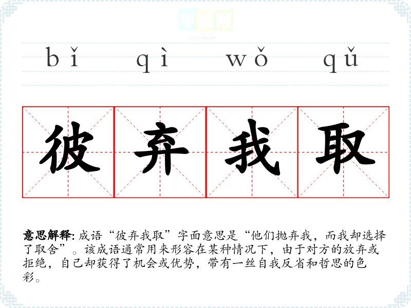 成语“彼弃我取”字面意思是“他们抛弃我,而我却选择了取舍”。该成语通常用来形容在某种情况下,由于对方的放弃或拒绝,自己却获得了机会或优势,带有一丝自我反省和哲思的色彩。