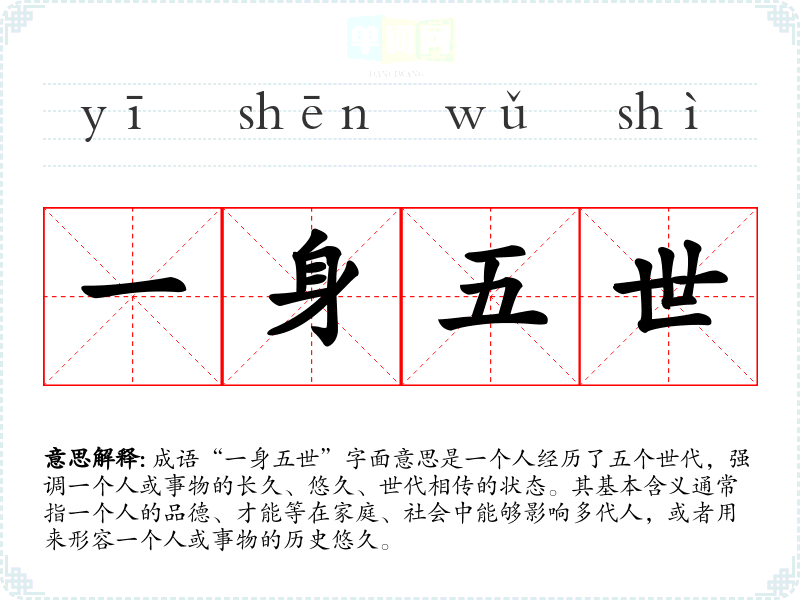 成语“一身五世”字面意思是一个人经历了五个世代,强调一个人或事物的长久、悠久、世代相传的状态。其基本含义通常指一个人的品德、才能等在家庭、社会中能够影响多代人,或者用来形容一个人或事物的历史悠久。