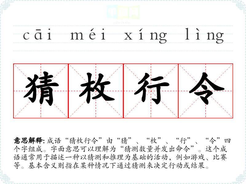 成语“猜枚行令”由“猜”、“枚”、“行”、“令”四个字组成。字面意思可以理解为“猜测数量并发出命令”。这个成语通常用于描述一种以猜测和推理为基础的活动,例如游戏、比赛等。基本含义则指在某种情况下通过猜测来决定行动或结果。