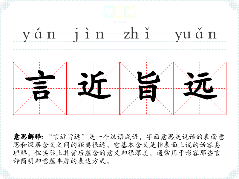 “言近旨远”是一个汉语成语,字面意思是说话的表面意思和深层含义之间的距离很远。它基本含义是指表面上说的话容易理解,但实际上其背后蕴含的意义却很深奥,通常用于形容那些言辞简明却意蕴丰厚的表达方式。
