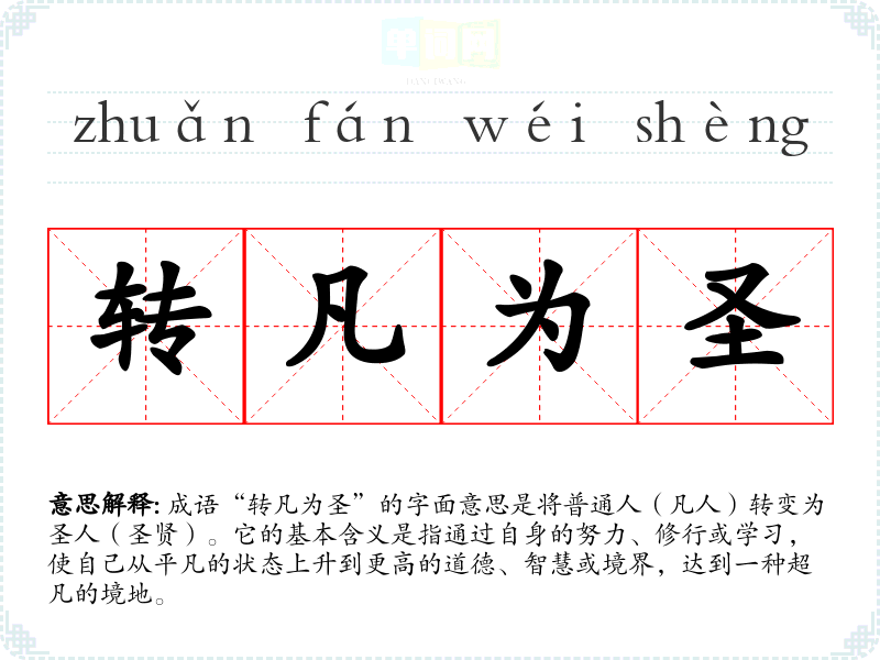 成语“转凡为圣”的字面意思是将普通人(凡人)转变为圣人(圣贤)。它的基本含义是指通过自身的努力、修行或学*,使自己从平凡的状态上升到更高的道德、智慧或境界,达到一种超凡的境地。