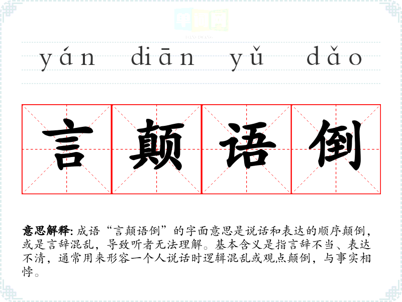 成语“言颠语倒”的字面意思是说话和表达的顺序颠倒,或是言辞混乱,导致听者无法理解。基本含义是指言辞不当、表达不清,通常用来形容一个人说话时逻辑混乱或观点颠倒,与事实相悖。