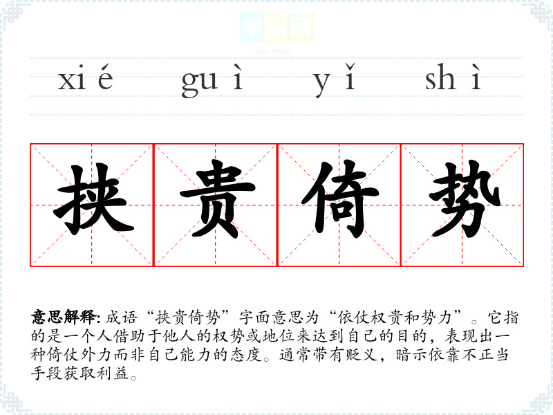 成语“挟贵倚势”字面意思为“依仗权贵和势力”。它指的是一个人借助于他人的权势或地位来达到自己的目的,表现出一种倚仗外力而非自己能力的态度。通常带有贬义,暗示依靠不正当手段获取利益。